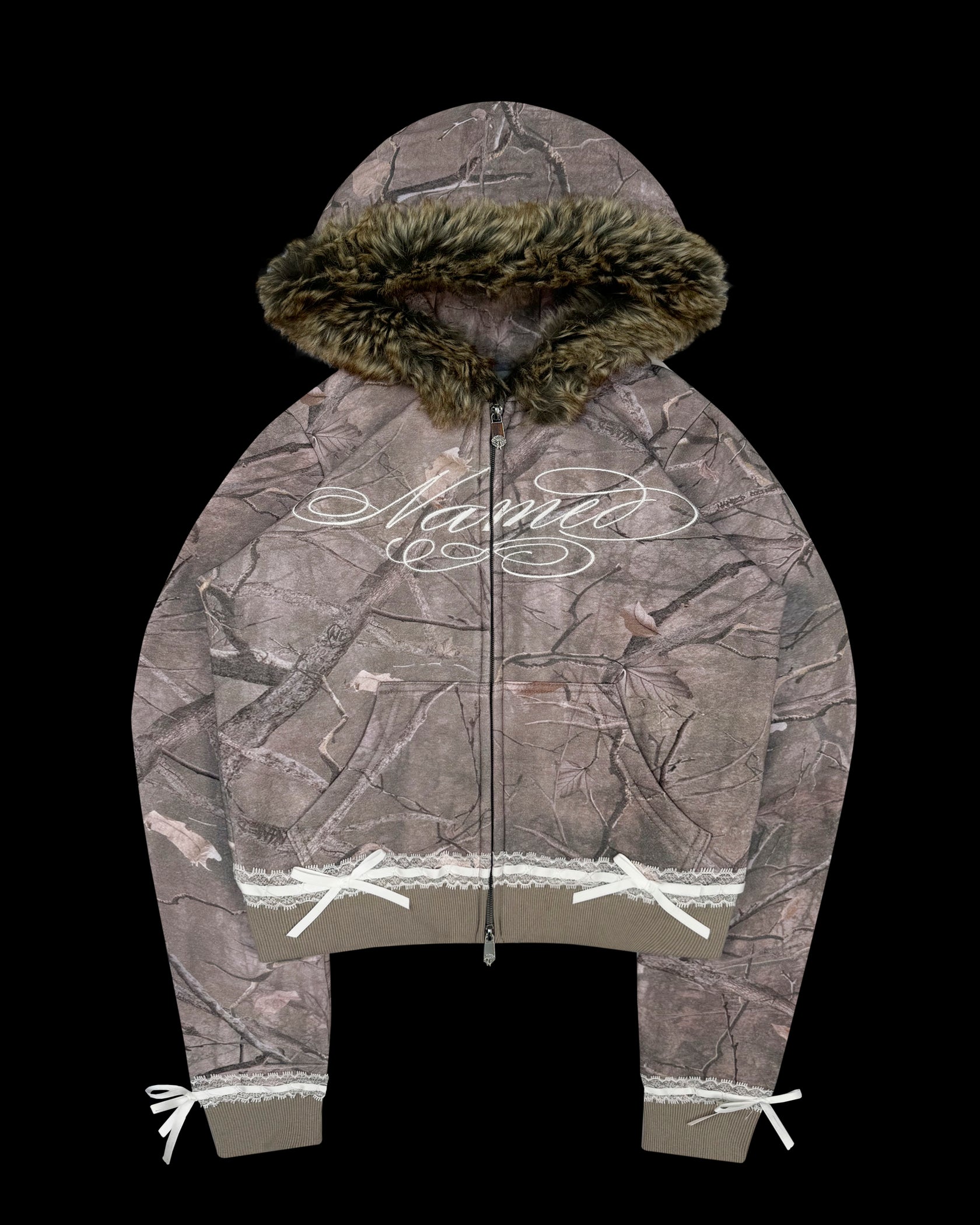 PREY FAUX FUR FITTED ZIP HOODIE TREE CAMO