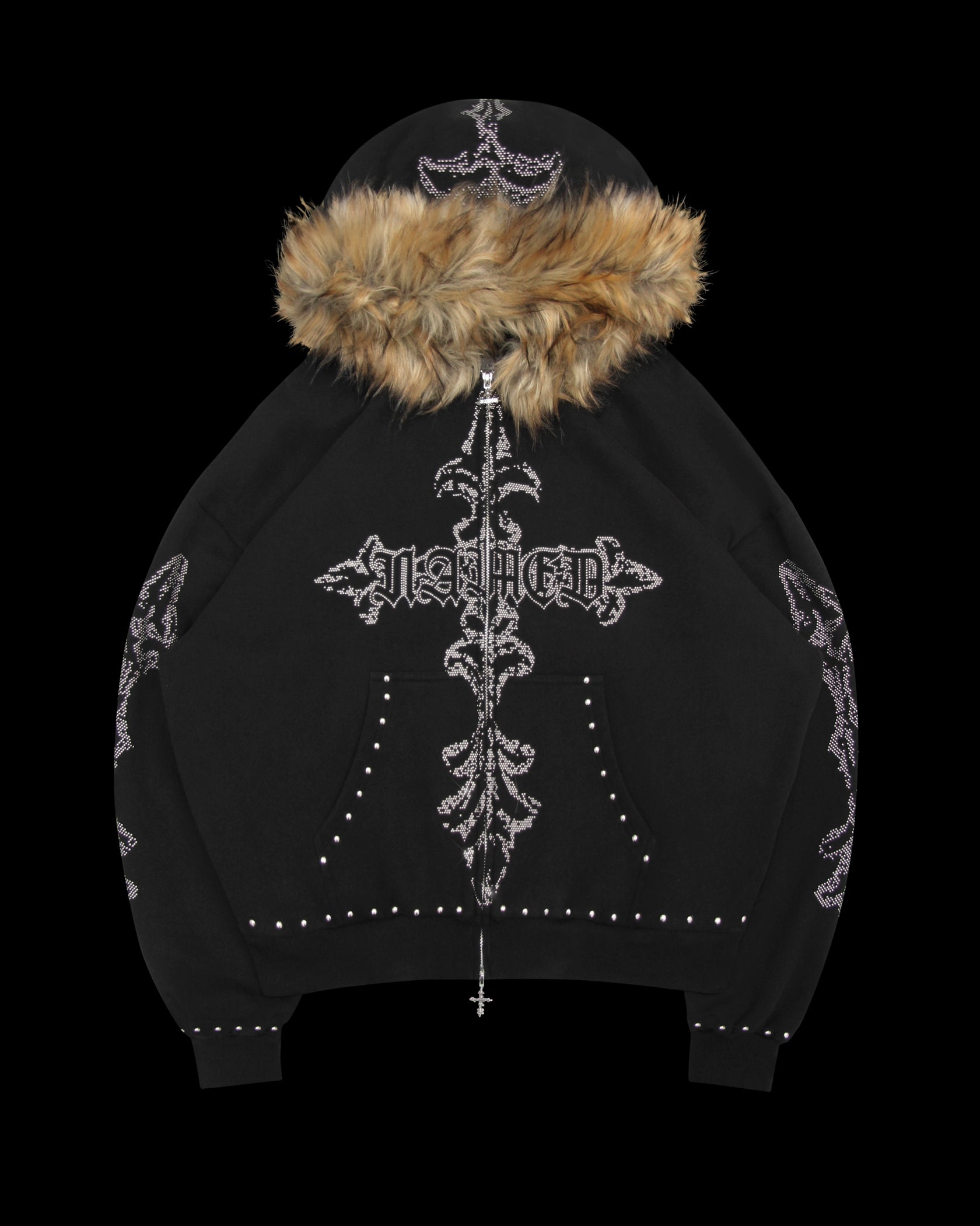 FERAL FAUX FUR STUDDED ZIP HOODIE BLACK
